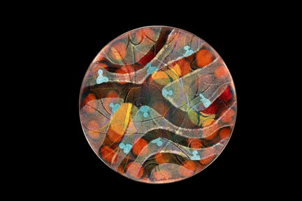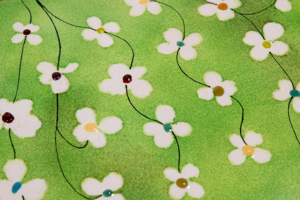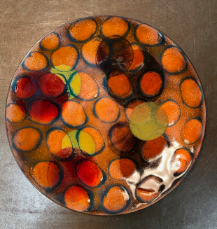 4-Lorsque le haut de la plaque est émaillé, je m’attaque au bas de la plaque. Je choisis un brun et un rouge. Je les applique dans la partie du bas qui est encore blanche. Je décide alors d’utiliser la technique de l’instillé à l’eau. Je remplis une seringue et je verse de l’eau un peu partout sur la poudre. Ensuite, je relève la plaque à la verticale pour faire descendre l’eau et je tourne la plaque dans les airs aussi pour permettre à l’eau de de créer d’autres sillons. Je fais sécher. J’enfourne.