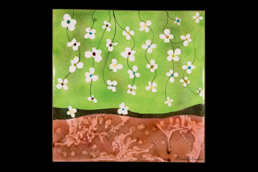 1-J’ai nettoyé, émaillé et contre-émaillé une pièce carrée de 30,5 cm X 30,5 cm. J’ai pensé utilisé le blanc opale OP 835 (Thompson) pour la première fois pour couvrir entièrement le fondant émaillé sur toute la surface de la pièce. Ce blanc, selon mon amie Michèle, permet aux émaux transparents d’exprimer leurs belles couleurs. Cet opale exige une cuisson à forte température. J’ai dû en appliquer deux fois pour obtenir un blanc immaculé. Ma pièce de cuivre n’est pas de grande qualité, je dois alors minimiser le nombre de cuissons afin d’empêcher le cuivre de se déformer en refroidissant. Beau défi puisque j’ai déjà fait 4 cuissons.