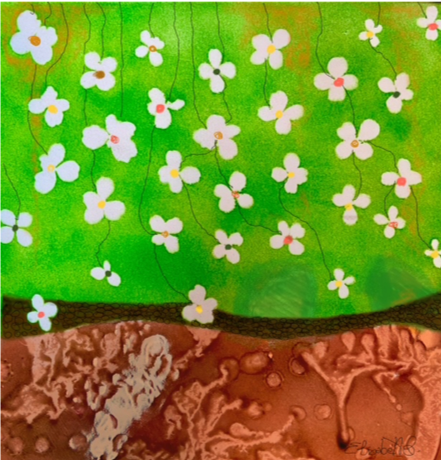 5-J’ai l’idée de modifier cette photo sur ma tablette Ipad à l’aide de mon Apple pen. Je vais colorer et dessiner sur cette photo pour explorer toutes les possibilités. On y voit de gros reflets de lumière, je vais essayer de les camoufler un peu. Je salis un peu le vert avec du orangé opaque. Je trace le cœur des fleurs à l’aide du crayon Apple pen ainsi que j’esquisse les branches tombantes.